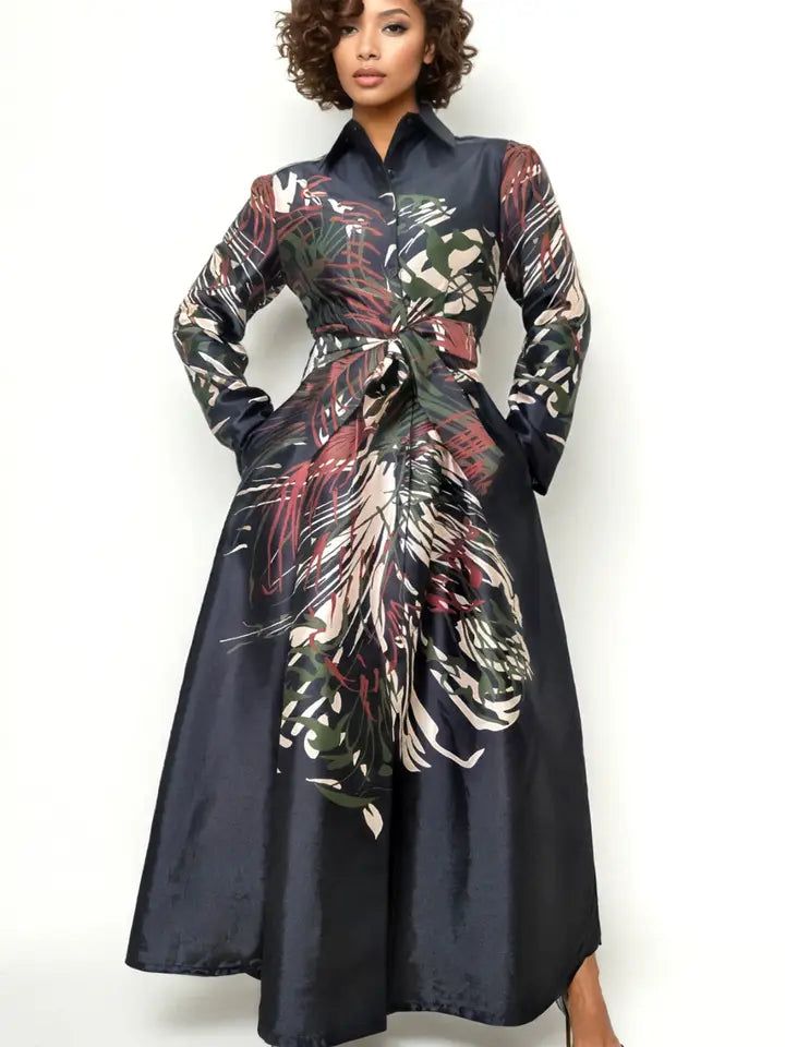 The Abstract Splash Maxi Dress combines artistic flair with refined elegance. This floor-length silhouette features a striking abstract splash pattern that commands attention while maintaining sophisticated appeal. The flowing maxi cut offers graceful movement and versatile styling—perfect for evening events, upscale casual occasions, or making a bold statement at any gathering. The design balances contemporary artistry with timeless femininity, making it a standout piece for those who appreciate wearable art with polish and poise.